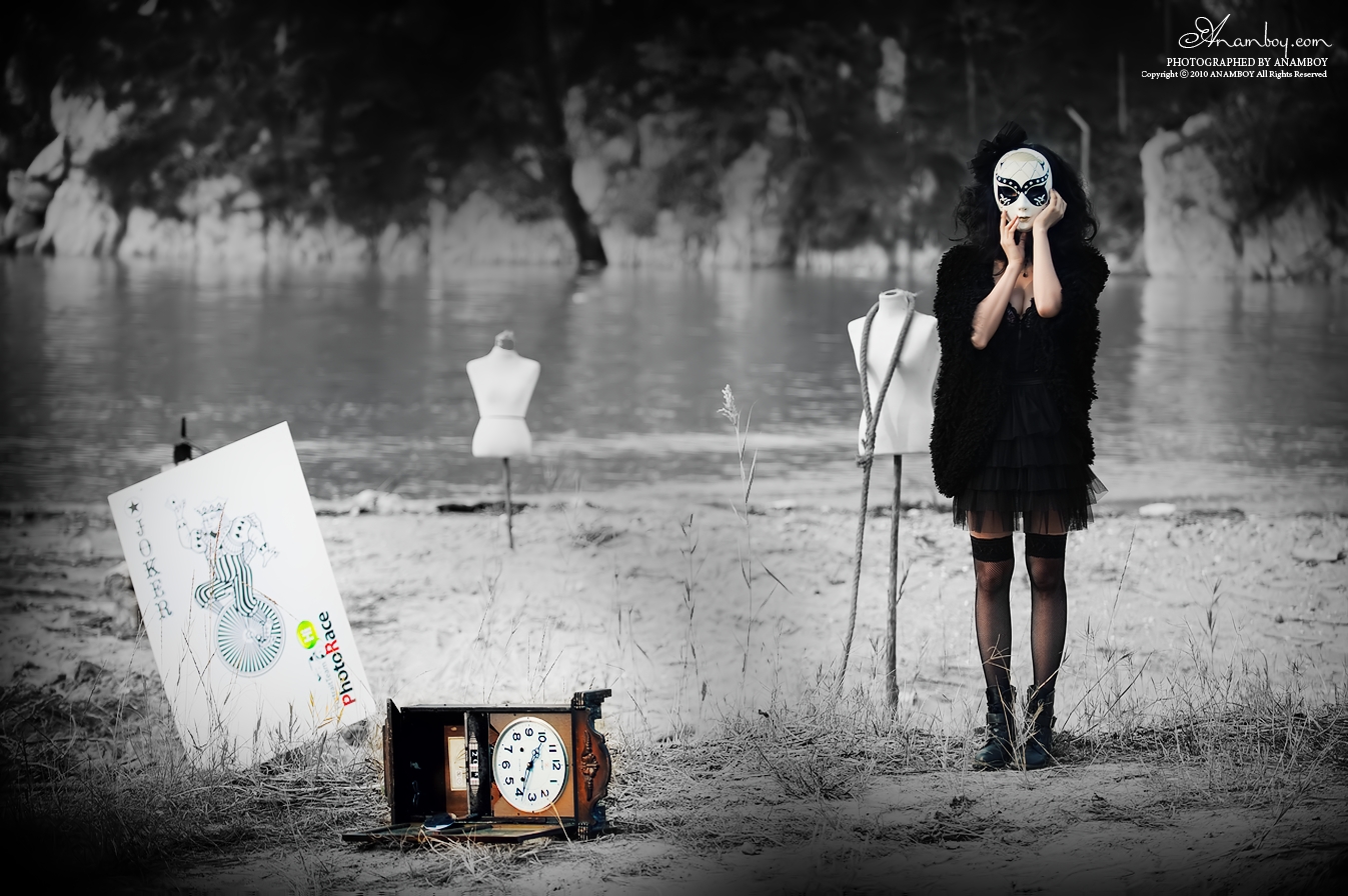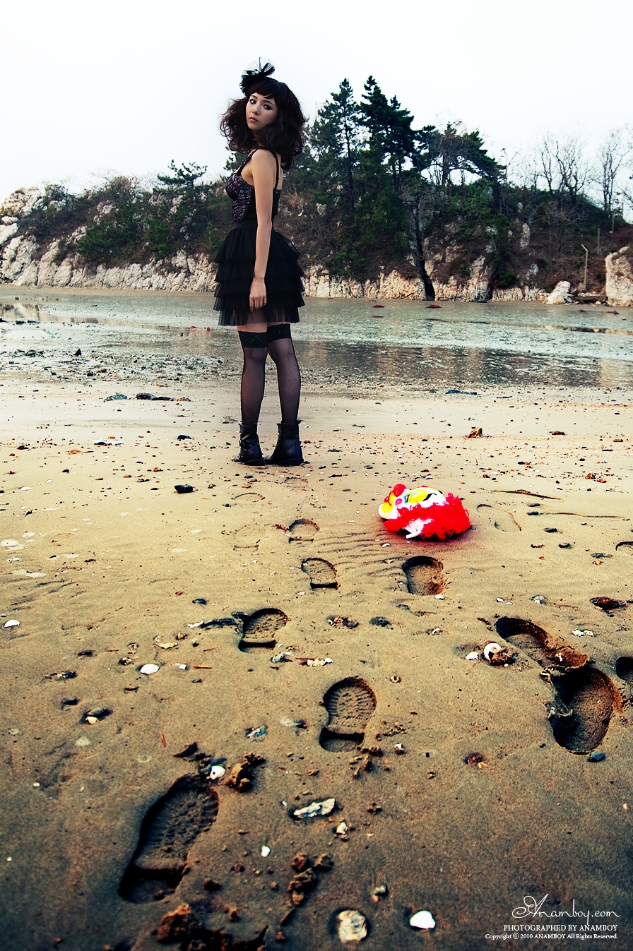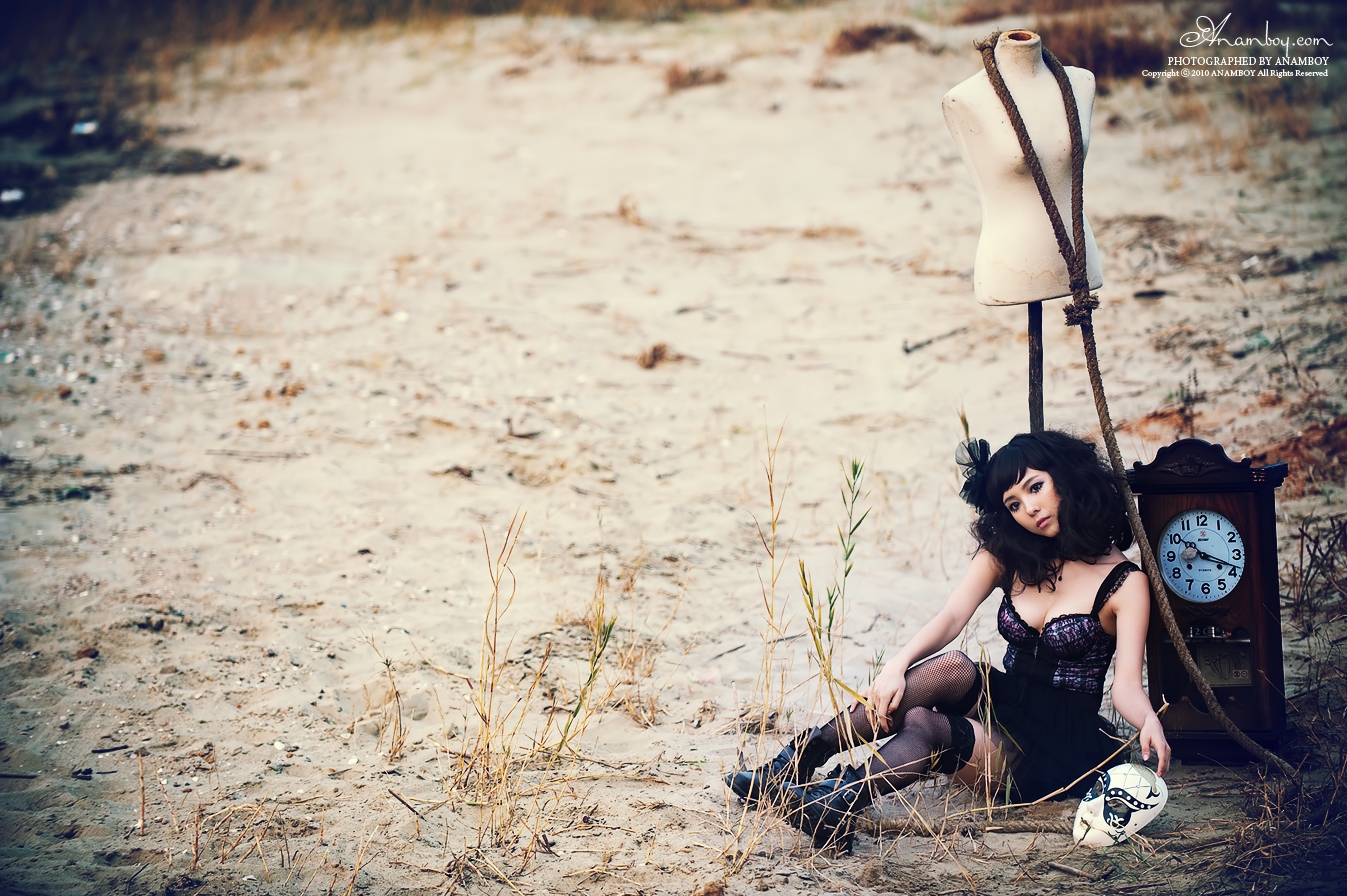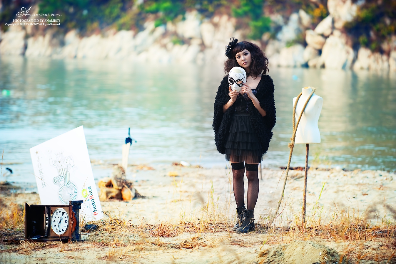 영광의 바닷가에서 오래 된 시계와 밧줄 , 가면등이 약간은 으시시하게 만드는 사진에 웃음끼하나 없는 모델의 모습에서 감성이 묻어나오는 것 같습니다.