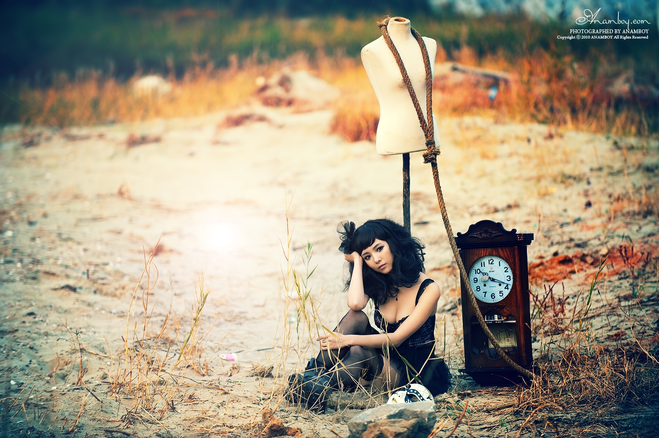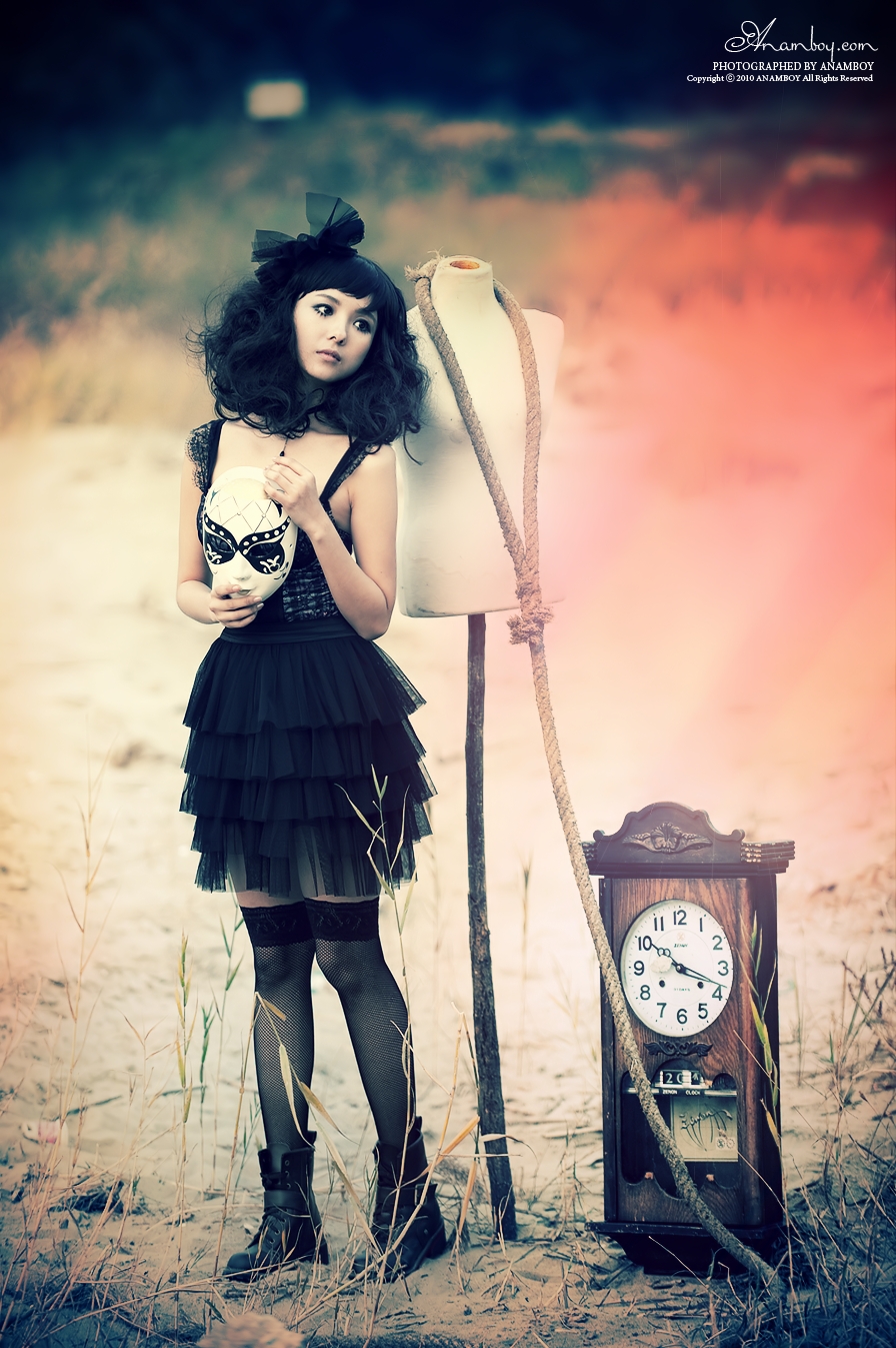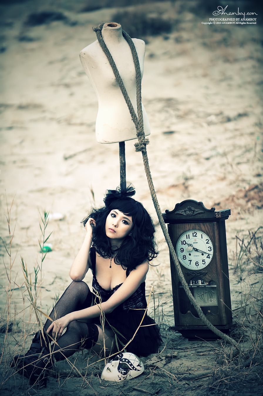 영광의 바닷가에서 오래 된 시계와 밧줄 , 가면등이 약간은 으시시하게 만드는 사진에 웃음끼하나 없는 모델의 모습에서 감성이 묻어나오는 것 같습니다.
