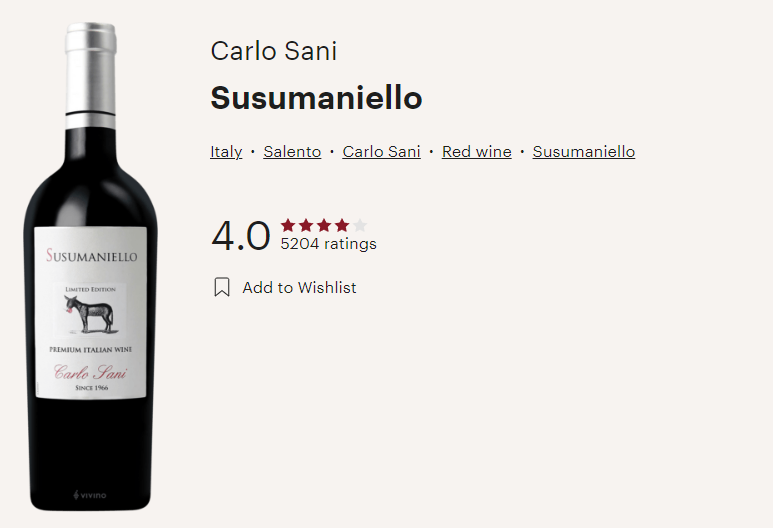 Carlot Sani, Susumaniello는 이탈리아 레드 와인으로 루비컬러에 연한 빛갈을 땐 와인으로 달콤한 꿀맛과 블랙베리 맛이 더해져 풍성한 라즈베리향이 느껴지는 맛입니다. 가격이 저렴해서 쉽게 손에 잡히는 와인이지만 어떤 음식과도 어울리게 마실수 있는 가성비 와인입니다. 가격이 저렴해서 데일리 와인으로도 좋고 약간의 달콤함이 거부감 없는 맛있는 와인으로 즐길 수 있습니다. 피니시 길이가 짧고 산도는 적절하고 타닌은 거의 느껴지지않아 여성분들이 좋아할수 있는 와인입니다. 가성비 좋은 와인이니 마트에서 와인장터 시에 2만원 기준으로 구매하시면 좋을 듯합니다.