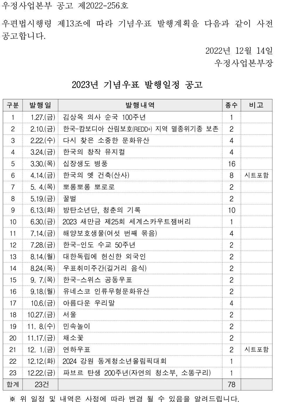 | 방탄소년단 노래로 전하는 우리의 순간 기념우표 사전판매 안내 (사전판매기간 (5/22 19:00~5/25 24:00) (0) | 2023.05.16 |