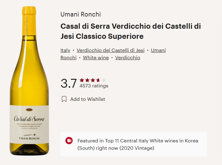 우마니 론끼, 까살 디 쎄라Umani Ronchi, Casal di Serra 와인은 이탈리아 마르케(Marche) 지역에서 생산하고 있는 화이트 와인입니다.