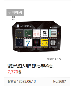 | 방탄소년단 노래로 전하는 우리의 순간 기념우표 사전판매 안내 (사전판매기간 (5/22 19:00~5/25 24:00) (0) | 2023.05.16 |
