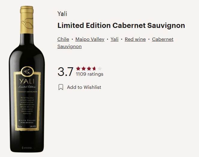 얄리, 프리미엄 리미티드 에디션 까베르네 소비뇽 은 칠레레드와인으로 진한 다크 레드색을 띠고 있으며, 비비노평점 World 3.7%의 준수한 평점의 와인으로 가성비 좋은 와인입니다.