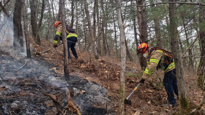 이 사진은 산불 피해 지역에서 소방관들이 작업하는 모습으로, 그들의 안전과 복구 작업의 중요성을 강조합니다.