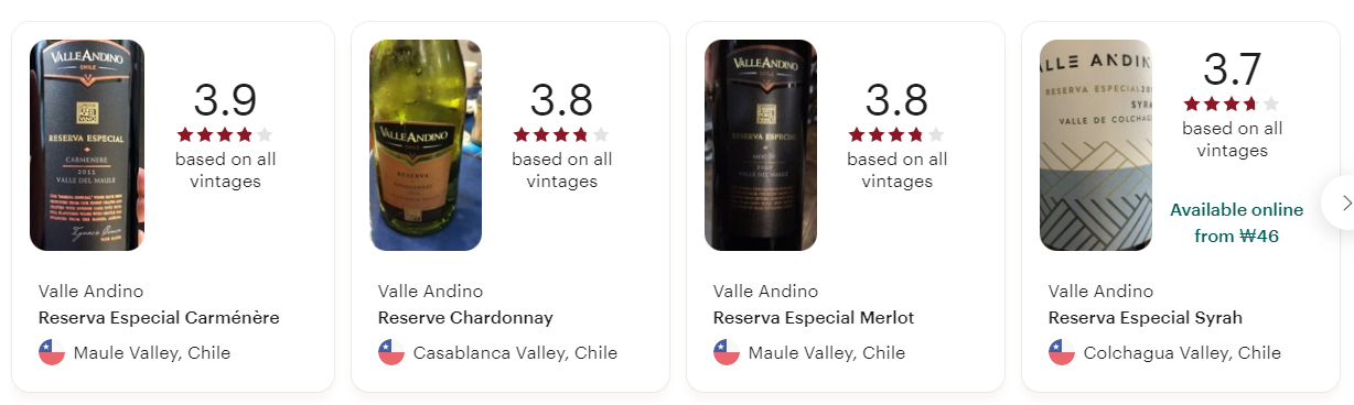 제가 가장 중요하게 생각하는 부분이 와인 랭킹입니다. 비비노의 경우 많은 사람들이 와인을 먹어보고 평가하고 평점을 주기때문에 가격이 평가에 반영되어있습니다. 즉, 가성비를 따져서 평가하는 것이 일반적입니다.