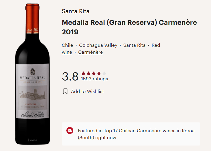 칠레와인, 산타 리타, 메달야 레알 까르메네르, Santa Rita, Medalla Real Carmenere (비비노평점 3.8점)